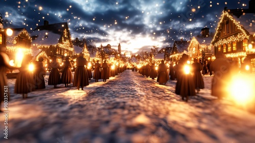 A magical winter scene with illuminated figures walking in the snow, surrounded by festive decorations and a glowing sky.