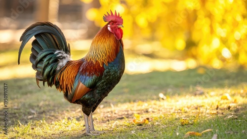 A magnificent colorful rooster standing on sunlit grass with a vibrant golden hour backgro