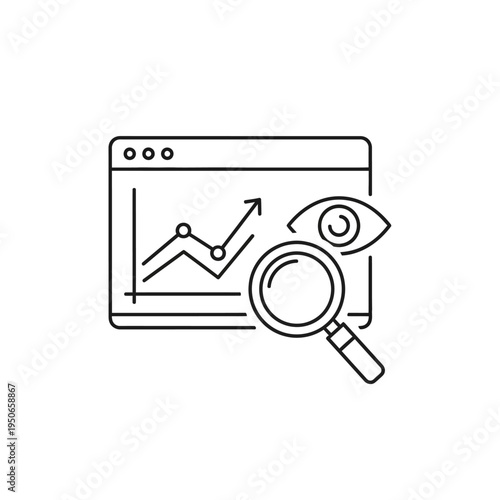 A magnifying glass and an eye examining a graph on a computer screen, symbolizing data analysis and insights.