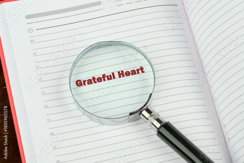 A magnifying glass offers a close-up view of the words Grateful Heart printed in bold red on a blank lined page in a notebook. The setting captures a moment of reflection
