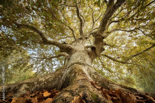 A majestic ancient tree viewed from its sprawling roots up to the golden autumn canopy, symbolizing life and stability