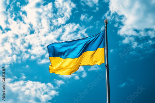 A majestic and inspiring image of the Ukrainian flag waving proudly in the wind against a bright blue sky with scattered white clouds.