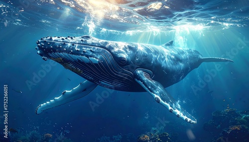 A majestic blue whale gracefully swims through the depths of the ocean, sunlight piercing the surface. Detailed depiction of the sea creature