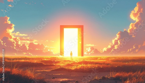A majestic glowing portal stands alone in a vast, golden landscape at sunrise, promising a journey into the unknown and new beginnings beyond the surreal horizon
