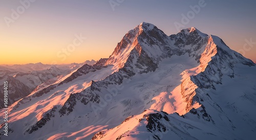A majestic mountain peak covered in snow, illuminated by the warm light of the rising or setting sun, creating a scenic alpine landscape.