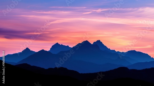 A majestic mountain range silhouetted against the colorful sky at dusk, with shades of pink, orange, and purple blending together as the sun sets behind the peaks.