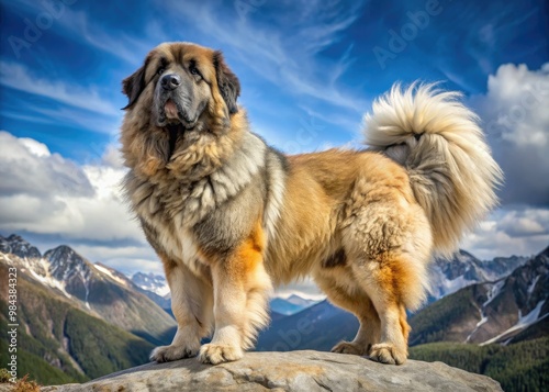A majestic ovcharka stands proudly on rocky terrain, its thick fur blown by the wind against a dramatic backdrop of craggy peaks.