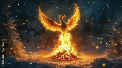 A majestic phoenix emerges from flames in a winter forest, symbolizing rebirth and transformation with a magical, fiery aura.