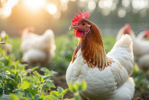 A majestic rooster stands proudly in a lush green field, its vibrant red comb and feathers contrasting against the calm surroundings of its outdoor home