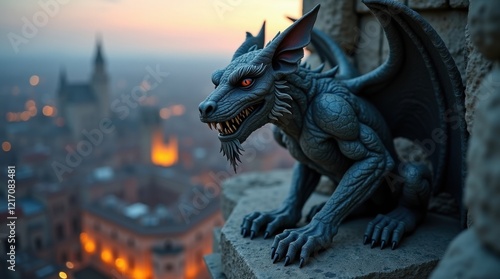 A majestic stone gargoyle, perched atop a weathered stone structure, gazes over a city bathed in the warm glow of twilight. Its detailed features and intense expression add to its mythical aura.