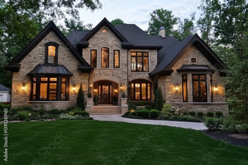 A majestic stone house bathed in warm evening light, exuding comfort and elegance with its inviting windows and landscaping, nestled amidst a lush green lawn and mature trees.