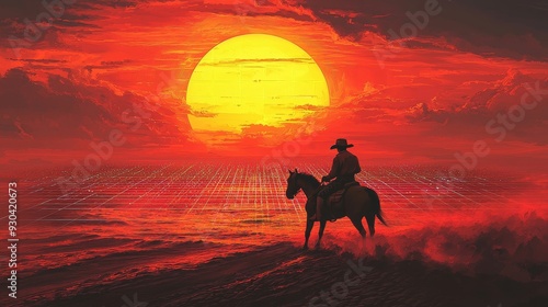 A majestic sunset over a shimmering sea, with a cowboy riding proudly along the shore, creating a breathtaking tranquil scene.