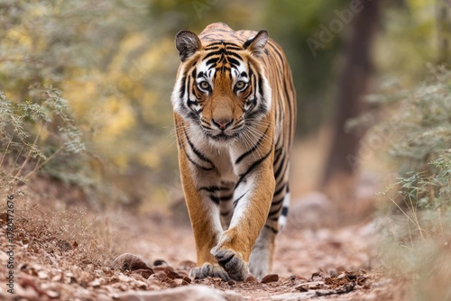 A majestic tiger strides confidently on a dirt path through a natural wilderness