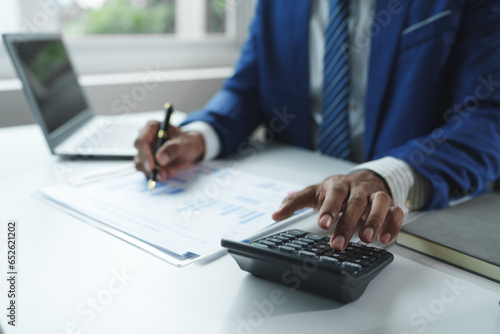 A male accountant or a business man uses a laptop to calculate investment results. And making financial reports on the desk Business finance accounting concept