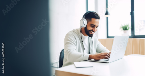 A male office worker concentrates on his computer screen amidst the sleek, contemporary setting of his workplace. generative AI