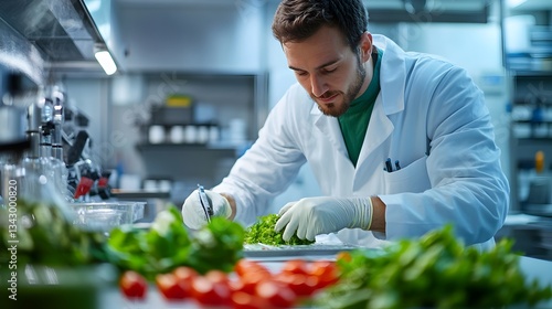 A male scientist in a lab coat meticulously examines fresh green leafy vegetables in a modern laboratory setting for research.