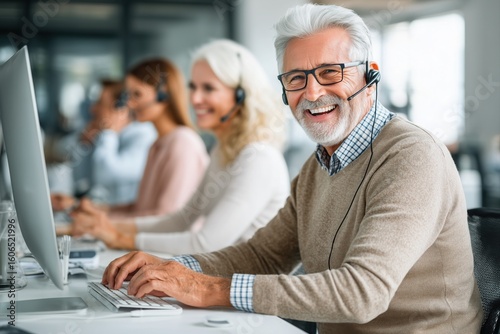 A man, a call center worker wearing a headset, sits at a desk using a computer while co-workers work in a modern office.