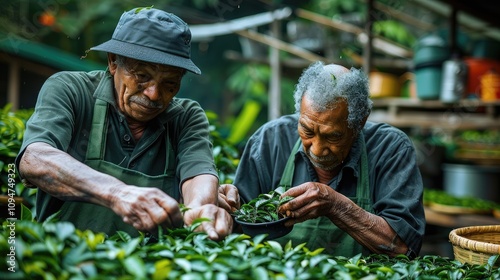 A man and an elderly person, wearing dark green with aprons over them, were carefully crafting tea leaves in the garden of their home.