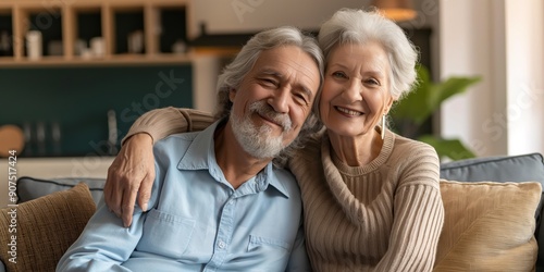A man and woman are sitting on a couch and smiling at the camera. The man is wearing a blue shirt and the woman is wearing a brown sweater. They seem to be enjoying each other's company