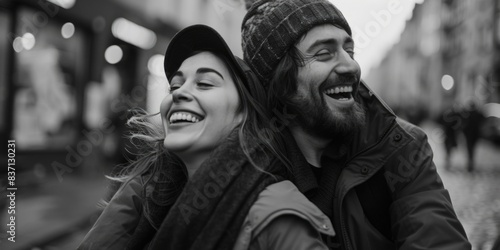 A man and woman are smiling and hugging each other on a street. The man is wearing a hat and the woman is wearing a scarf. Scene is happy and affectionate