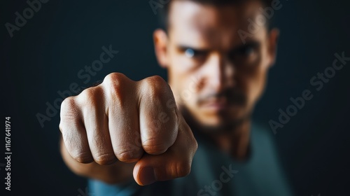A man displays intense focus and strength as he extends his clenched fist forward. The low lighting highlights his muscular build and determined expression, creating a captivating presence