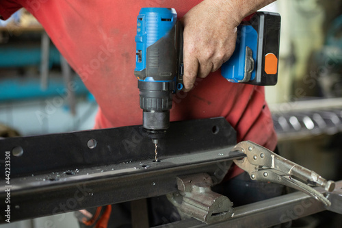 A man drills holes in the metal. The guy works in the garage.