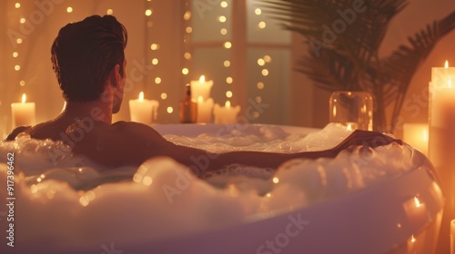 A man enjoys a relaxing bubble bath surrounded by candlelight, creating a serene and luxurious atmosphere.