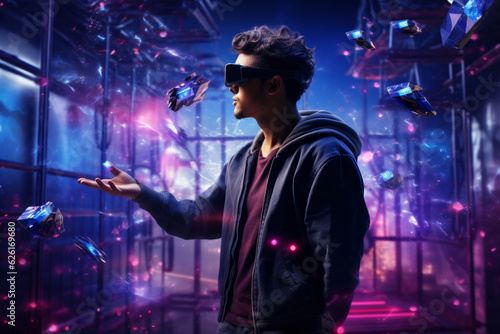 a man experiencing 4d Lights and shadows of the metaverse. AI Generated