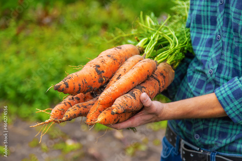 A man farmer holds a harvest of carrots in his hands. Selective focus.