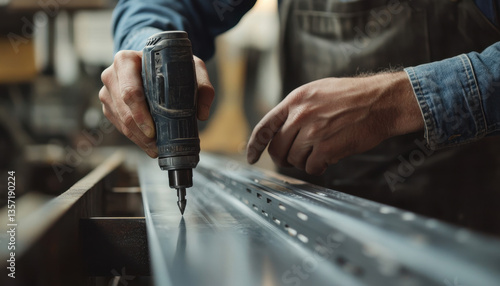 A man focuses on using an electric drill to securely fasten metal components, showcasing skilled craftsmanship in a workshop setting