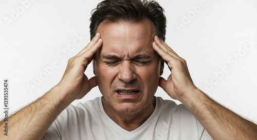 A man grips his temples, overwhelmed by a searing migraine, his face contorted in pain against a stark white background.