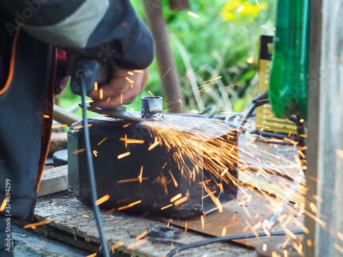 a man handles metal with an angle grinder. sparks from metal.