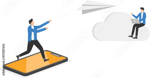 a man in a business suit is standing on the screen of a smartphone and lets a paper airplane to sky from the cloud