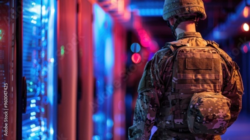 A man in a military uniform is standing in front of a computer server room