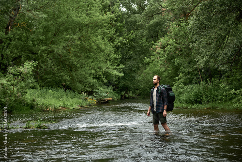 A man in a plaid shirt and green shorts with a large hiking backpack crosses the river