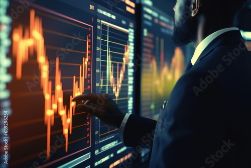 A man in a suit focused on analyzing information displayed on a computer screen. Suitable for business and technology-related concepts
