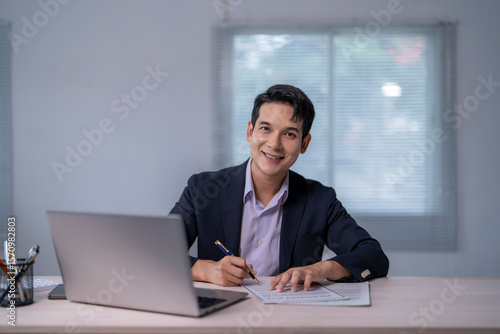 A man in a suit is sitting at a desk with a laptop and a pen