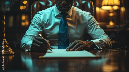 A man in a suit is writing on a piece of paper. He is wearing a blue tie and is sitting at a desk. Concept of professionalism and formality, as the man is dressed in a suit and tie