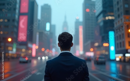 A Man in a Suit Looking Up at a Vibrant Cityscape. High quality
