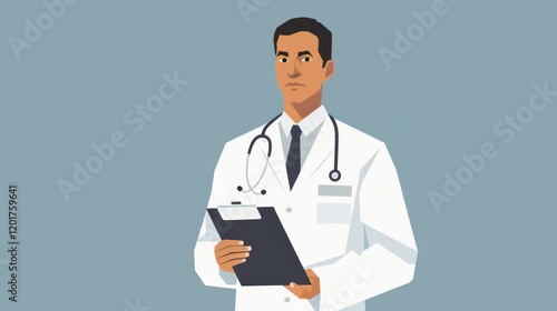 A man in a white lab coat holding a clipboard. He looks serious and focused. The clipboard is open to a page with a medical chart