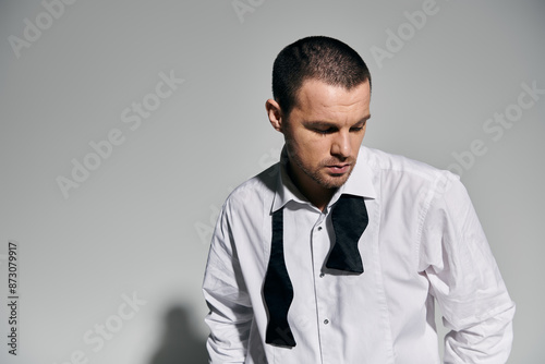 A man in a white shirt and black bow tie looks down, lost in thought.