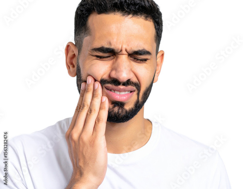 A man in a white shirt grimaces in pain while holding his cheek, suggesting toothache or jaw discomfort.