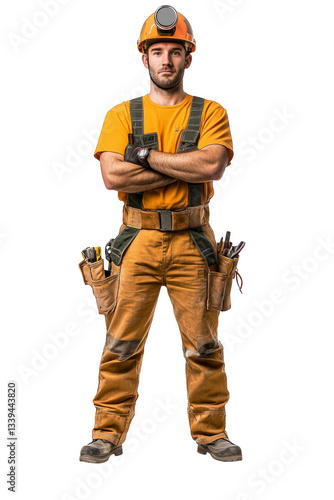 A man in a work uniform stands, confident professional, transparent background