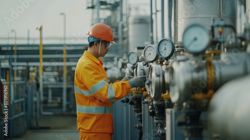 A man in a yellow and orange safety suit is working on a piece of equipment
