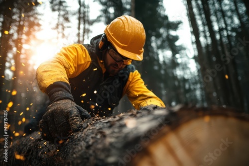 A man in a yellow jacket is cutting a tree with a chainsaw. He is wearing a yellow jacket and a hard hat