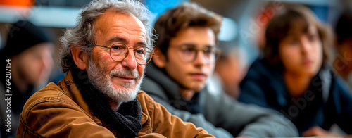 A man in his 60s with white hair and glasses sitting next to some young people