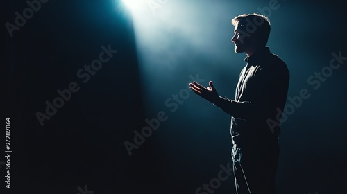 A man in silhouette stands on a stage with a spotlight behind him and speaks to an audience.