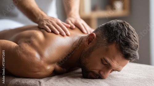 A man is receiving a back massage with gentle hand movements focused on relaxation and wellness, lying face down on a comfortable massage table within a spa setting, promoting healthy lifestyle...