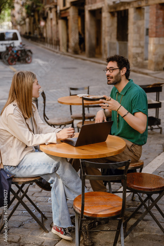 A man is talking to a woman sitting across from him at a table with a laptop on it