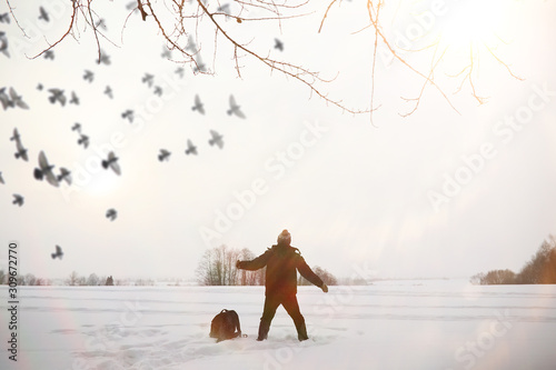 A man on a walk. Winter landscape. Tourist in winter journey.